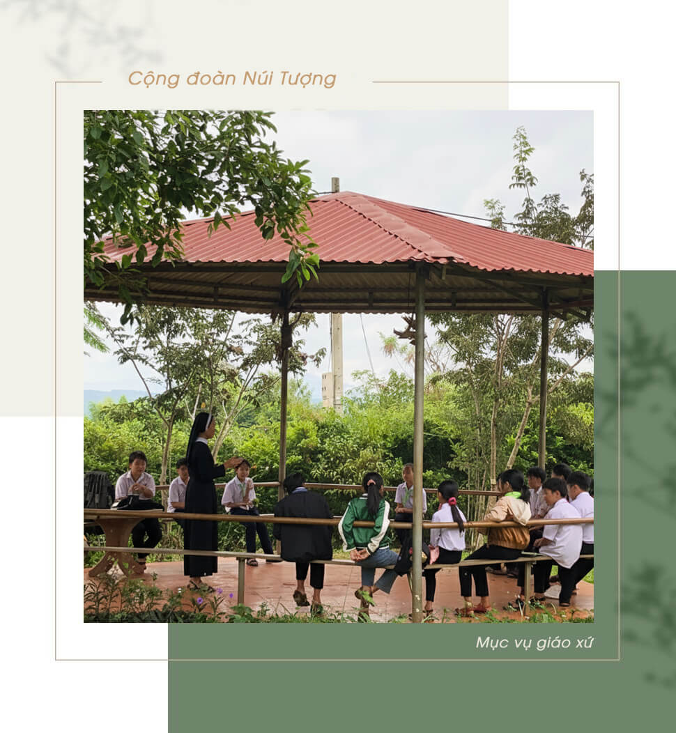 Chị em hiện diện và phục vụ giáo xứ: dạy Giáo lý, phụ trách lễ sinh, phòng thánh, trao Mình Thánh Chúa, ca đoàn thiếu nhi, giúp điểm truyền giáo Núi Chóc, thăm viếng người nghèo, bệnh tật, già yếu neo đơn, thăm viếng những gia đình hôn nhân rối... Chị em cũng nhận nuôi dạy trẻ Mầm Non. Tháng đầu tiên chị em nhận được 12 trẻ, đa số các bé sống xa cha mẹ, ở với ông bà, vì cha mẹ ly dị hoặc đi làm xa.